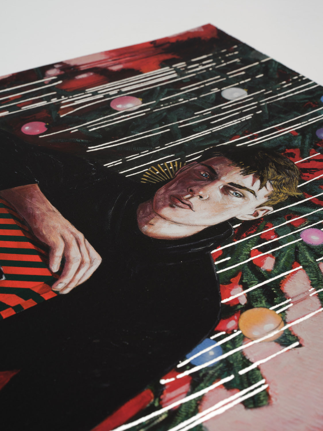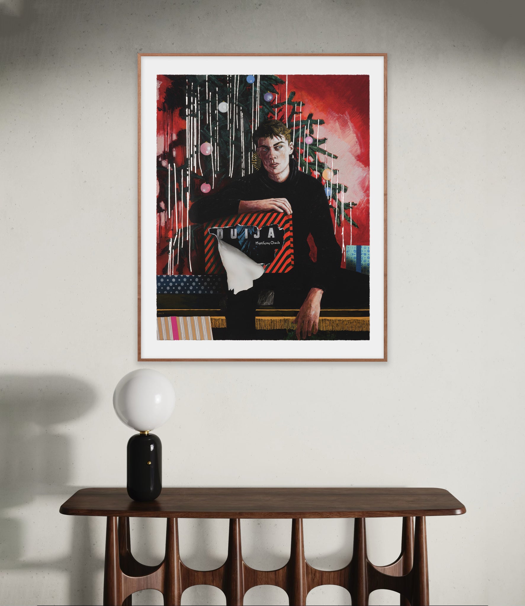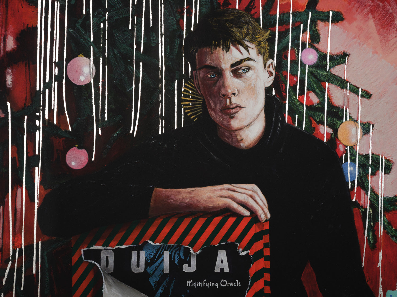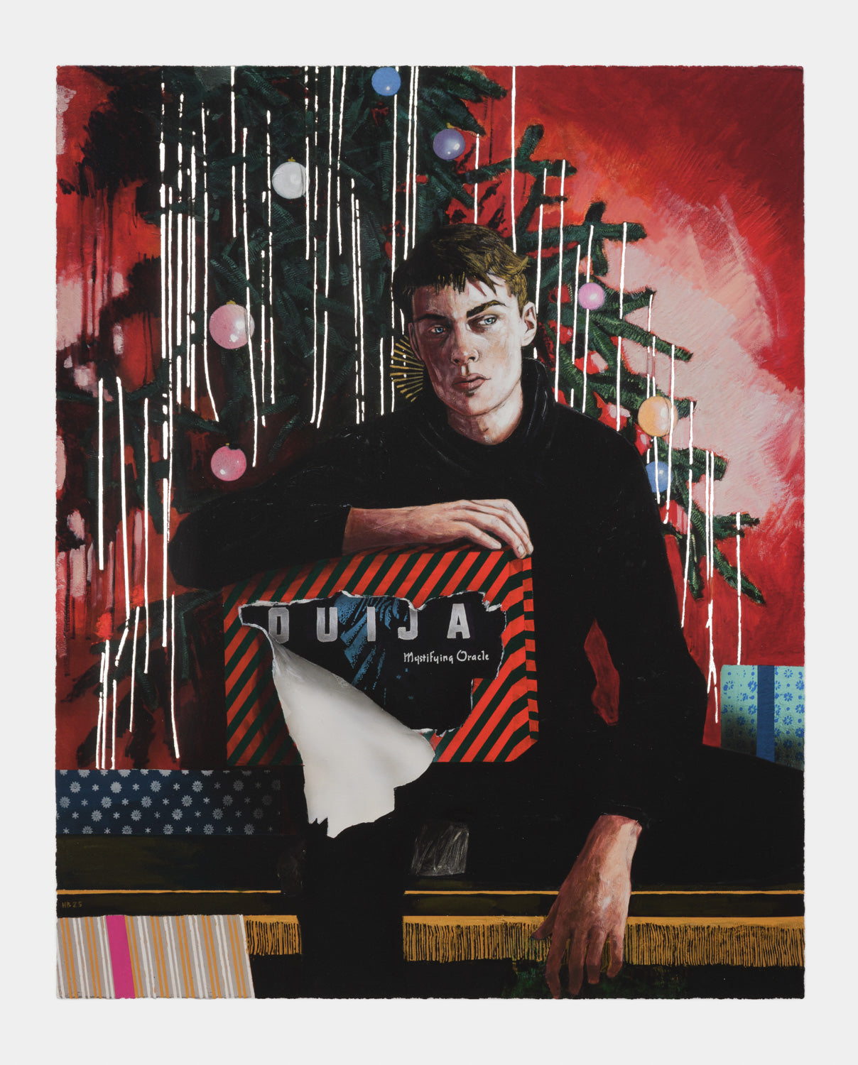 Statement from the artist: "I’ve owned a vintage Ouija Board for a few years now. I used the box as the reference for this painting. It sits in my cabinet of curiosities collecting dust. I’ve never used it and don’t intend to. Am I afraid to? Maybe. It was designed as a form of entertainment, a literal toy, but, unlike Monopoly, the game allegedly doesn’t end when you put it away. The popular phrase, if you watch the paranormal shows flooding our screens, is that ‘you’ve opened a door’ and, get ready for it, ‘you might not like what’s behind it.’ I never found a Ouija board under the tree on Christmas morning, but to my surprise I’ve been told by a few friends that they had. You might think they had goth parents, but that wasn’t the case. I was a bit shocked to hear a potential portal to the spirit world was nestled next to a Barbie or a box of Legos wrapped up in colorful wrapping paper waiting to be torn open with glee. Throw in a deck of Tarot cards while you’re at it. The title of this work is an obvious pun, (I’m fond of those) but I was oblivious to the idea of this being an actual present given to children, and that, to me, makes it extra funny.”